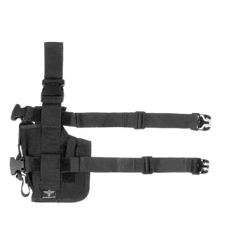 Étui de cuisse réglable qui s'adapte à toute une gamme de pistolets. Des étuis peuvent être attachés la ceinture et autour de la cuisse pour qu'elle soit bien en place.