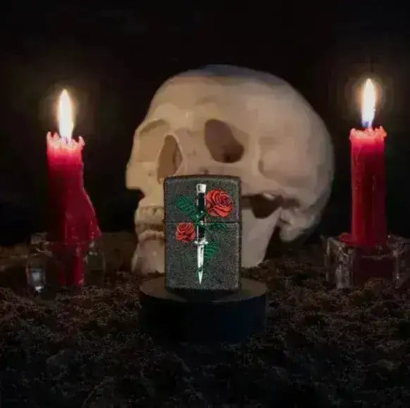 Un vrai classique avec un couteau stylet et des roses style tatouage. La finition Black Crackle® donne une surface mate et rugueuse, c'est un effet élégant qui signifie également que vous ne voyez pas les empreintes digitales.