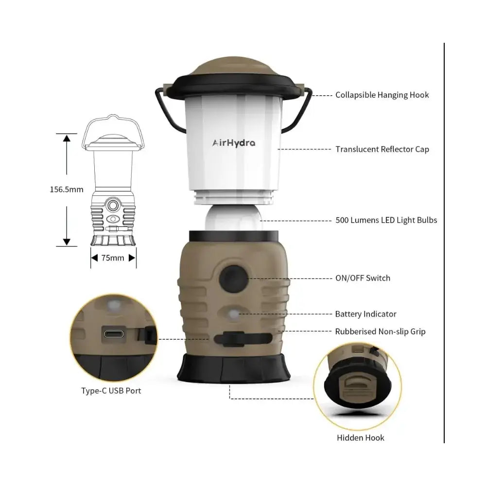 Skywoods 500 Lumens Camping Lantern er en kraftig og allsidig oppladbar lykt laget for camping, vedlikeholdsarbeid og nødbelysning. Den har et robust lampehus i PC + ABS med IPX5 vanntetthet og støtmotstand på opptil 1 meter. Med 15 høyeffektive 2835 LED-dioder leverer lampen opptil 500 lumen og tilbyr flere lysmoduser for ulike behov, inkludert strobelys for varsling. Praktiske kroker i både topp og bunn gjør den enkel å henge opp i telt, på grein eller stativ.