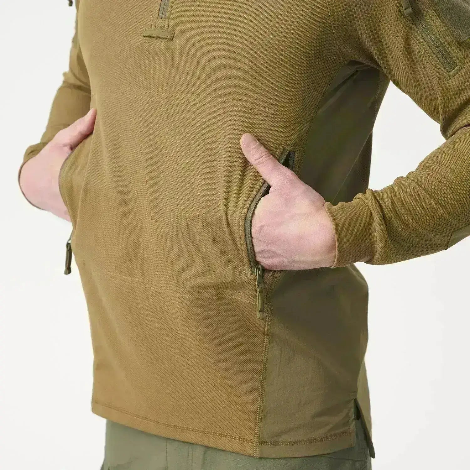 Le sweat à capuche Range allie confort et fonctionnalité. Le matériau ripstop extensible permet une mobilité totale, tandis que la doublure en polaire douce procure de la chaleur. La capuche est réglable avec un cordon de serrage et possède des bords renforcés. Les manches sont dotées de trous pour les pouces et de poches zippées sur le haut des bras, parfaites pour ranger du petit équipement.