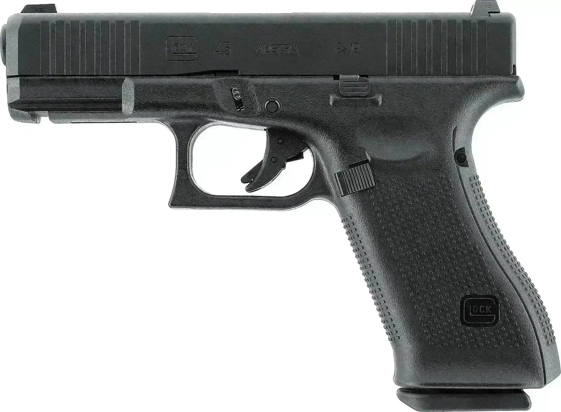 Glock 45 er en kompakt pistol med fullstørrelse ramme, enkel å håndtere og med ambidekstri funksjoner for både høyre- og venstrehendte brukere. Justerbar hop-up gir mulighet for fininnstilling av kulebanen, og 21mm rail under løpet gir feste for lykt eller laser.