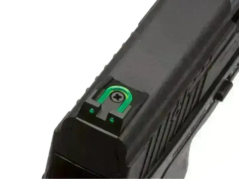 Les viseurs en fer sont des fibres optiques vertes qui facilitent la visée. Sous le canon se trouve un support de 21 mm pour fixer une lampe de poche ou un laser si vous le souhaitez.