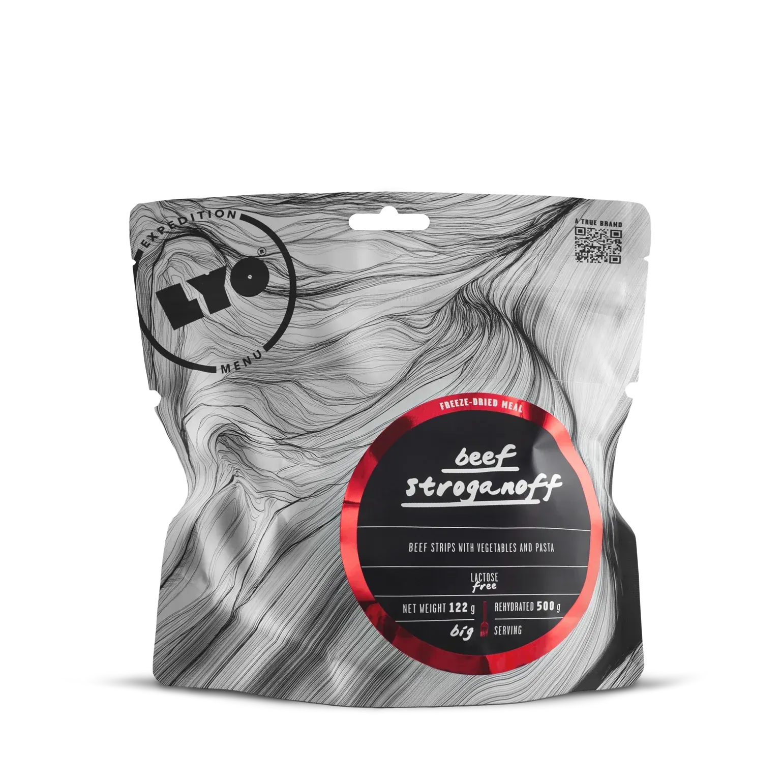 LYOFOOD Beef Stroganoff gir deg smaken av en ekte kremet biffgryte på tur. Retten kombinerer møre biffbiter, ris, sopp og en fyldig paprikasaus – laget med 100 % naturlige ingredienser uten kunstige tilsetningsstoffer. Perfekt for deg som trenger en større, kraftigere porsjon etter lange dager på fjellet, jakt eller ekspedisjoner. Frysetørket for lav vekt og lang holdbarhet.