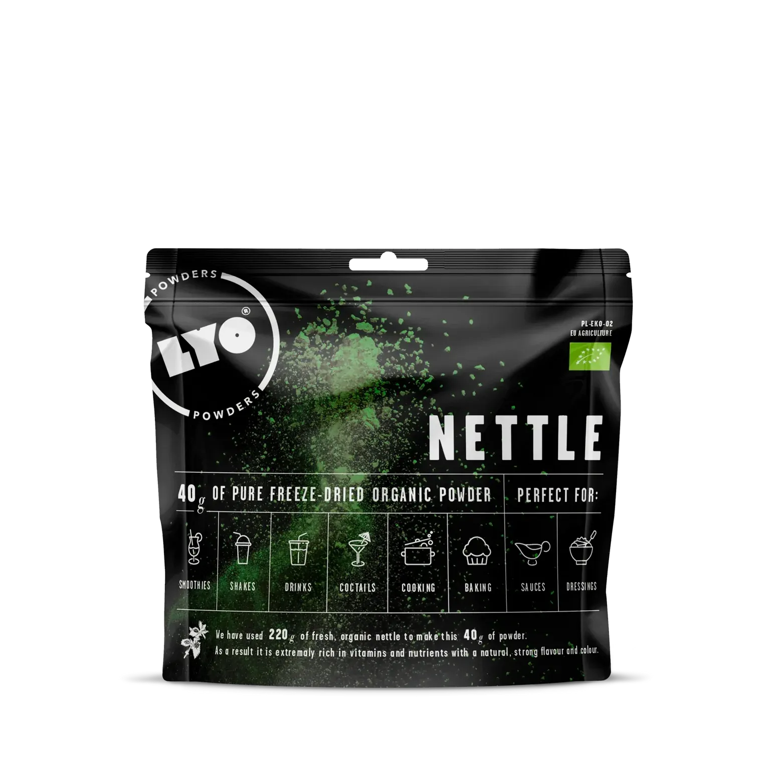LYOFOOD Nettle Powder gir deg alle fordelene fra nesle, skånsomt tørket og malt til et praktisk pulver. Rik på jern, kalsium, vitamin C og fiber, perfekt for å styrke kostholdet naturlig. Brukes i smoothies, supper, urtedrikker eller baking. 100 % økologisk, uten tilsetningsstoffer, med lang holdbarhet og lav vekt.