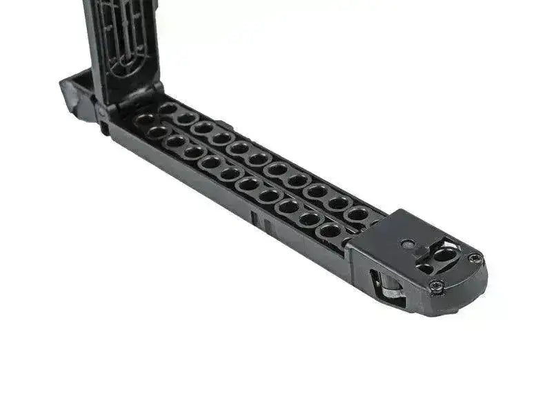 Construit avec une glissière en métal solide et un cadre en polymère et avec un énorme 30 (!!!) cartouches dans le chargeur, c'est le premier pistolet de ce type. Le chargeur est alimenté par bande et le pistolet est semi-automatique capable de tirer des plombs de 4,5 mm et des BB aussi vite que vous pouvez appuyer sur la gâchette ! Avec un blowback réaliste et alimenté par une cartouche de CO2 de 12 grammes maintenue dans la poignée, vous pouvez tirer vos munitions jusqu'à 430 ips !!! (selon le poids/la composition des munitions). Avec autant de cartouches dans le chargeur, cette arme est idéale pour des heures de plaisir !