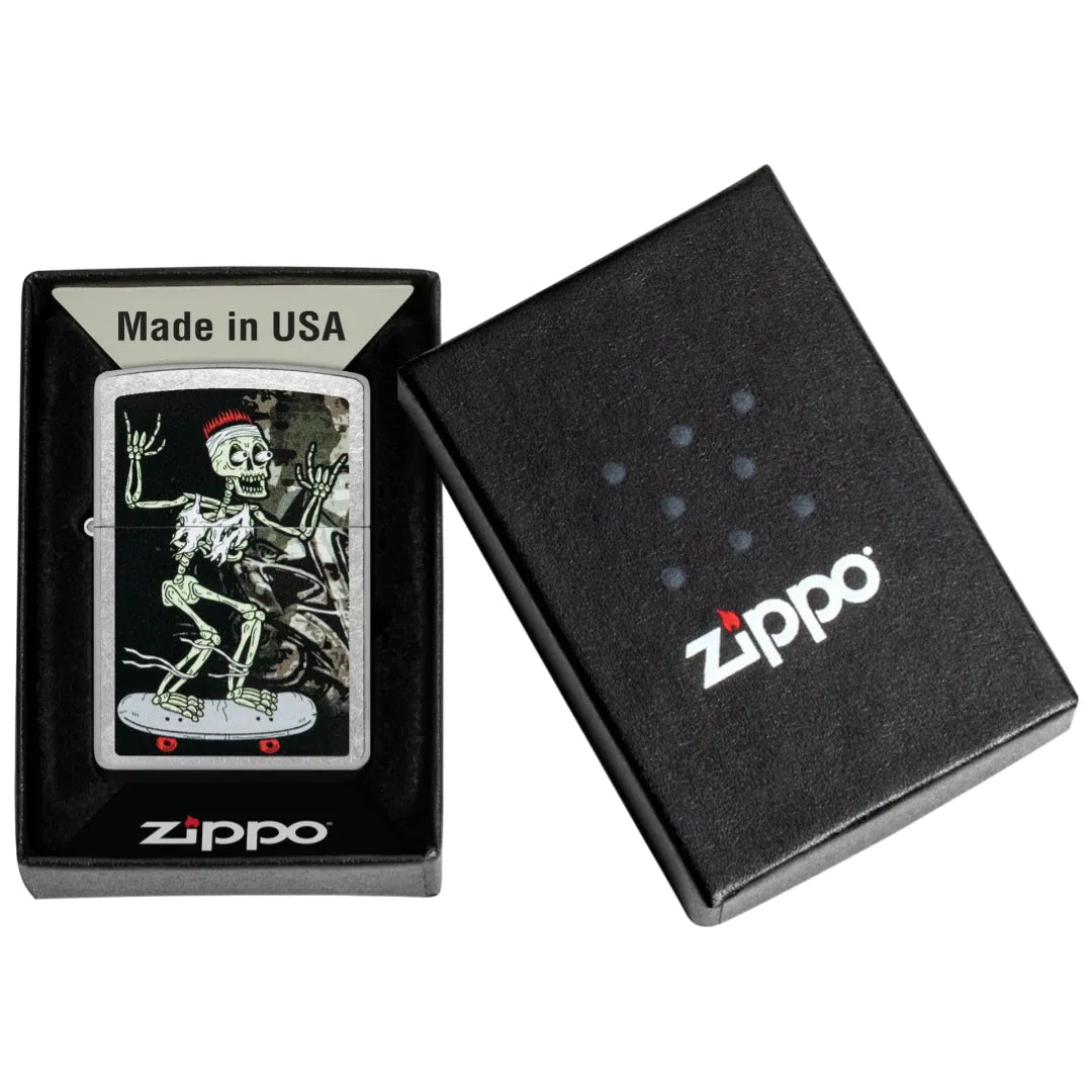 Un briquet Zippo emblématique avec un design « Skating Skeleton » robuste imprimé sur une surface Street Chrome classique. Parfait pour les amateurs de skate et les collectionneurs. Le briquet Zippo est livré dans un coffret cadeau et fonctionne de manière optimale avec l'essence Zippo.