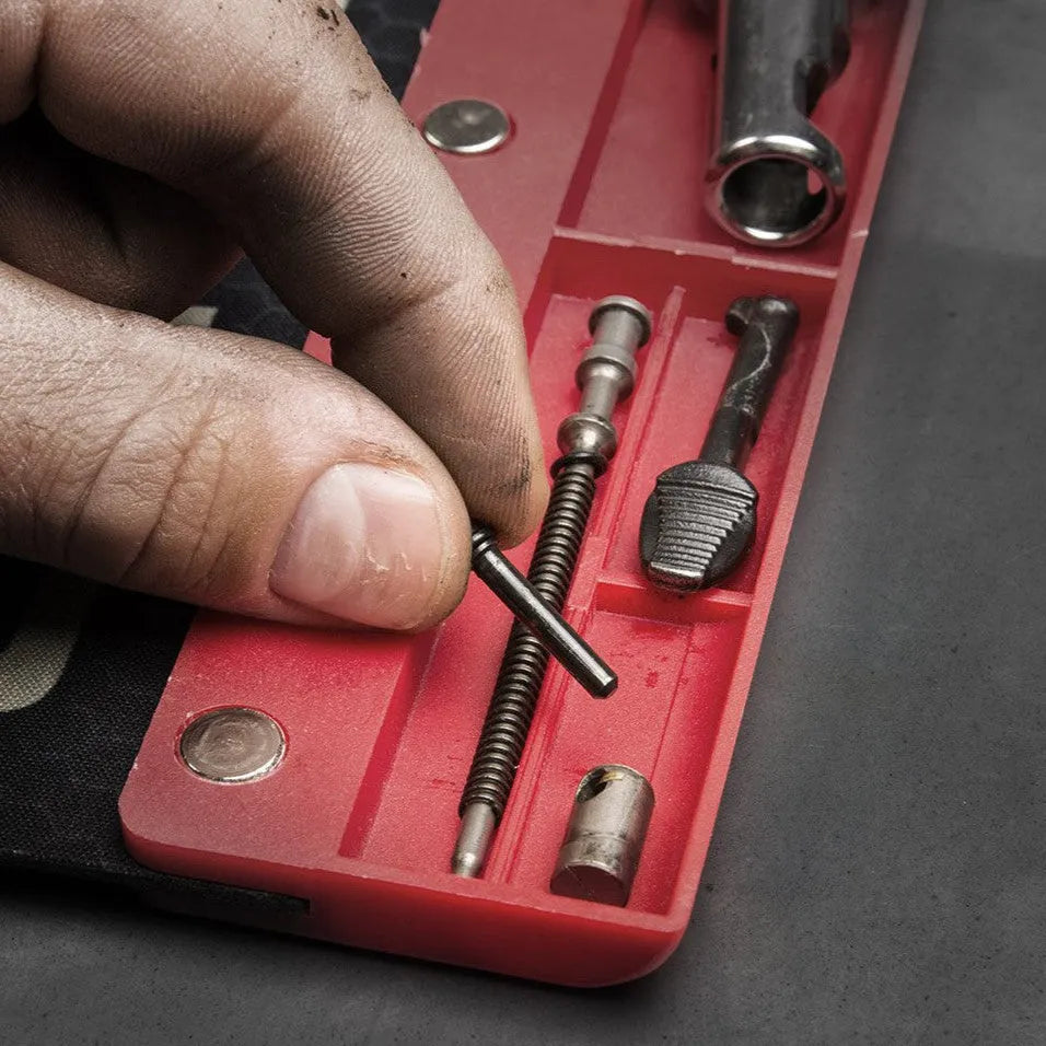 Matten har et slitesterkt belegg som både er olje- og vannavvisende, noe som beskytter både våpenkomponenter og bordflate. Undersiden er utstyrt med sklisikkert materiale for ekstra stabilitet under bruk. Den innebygde deleskålen med magnetisk seksjon holder smådeler og skruer på plass gjennom hele prosessen – perfekt for å unngå tapte komponenter.