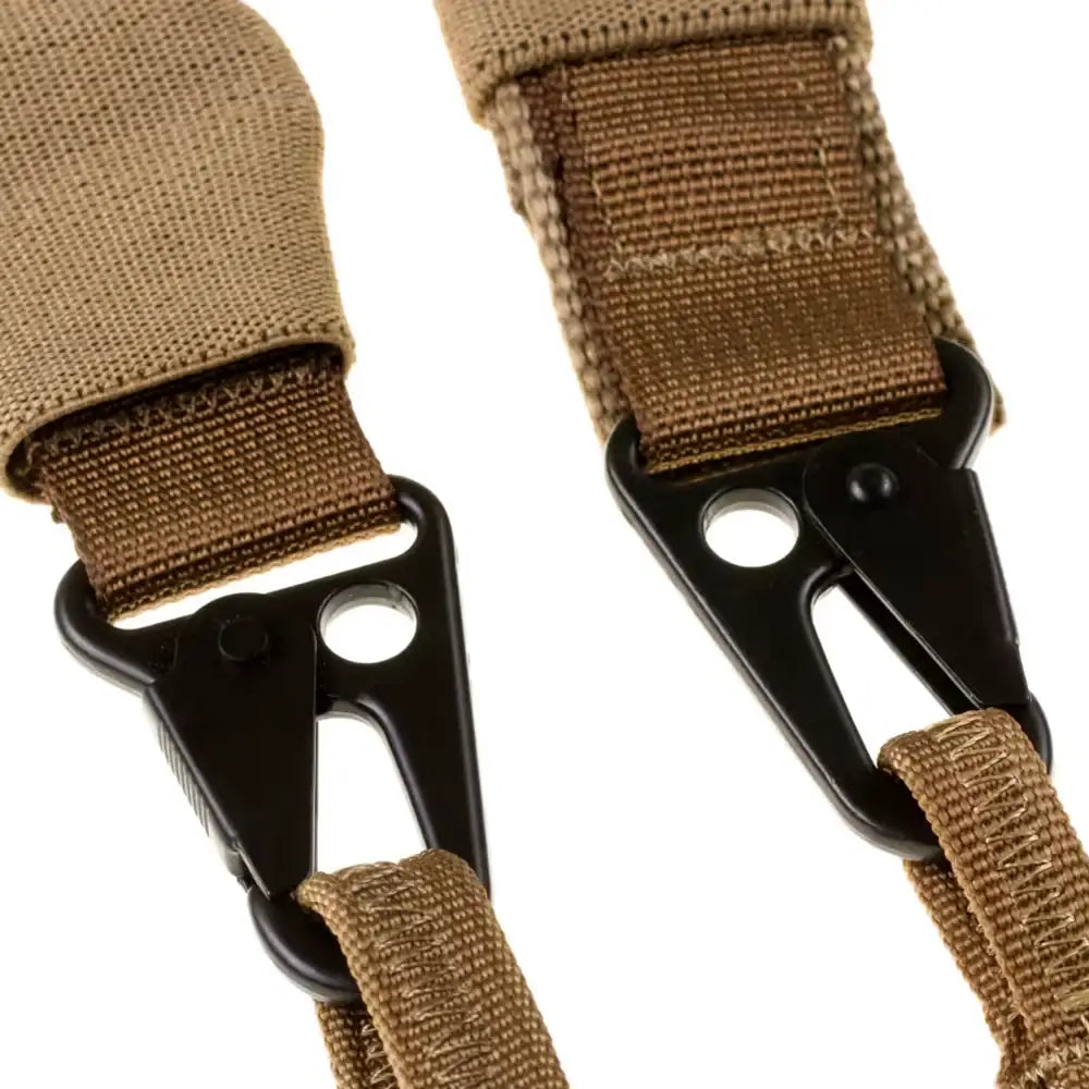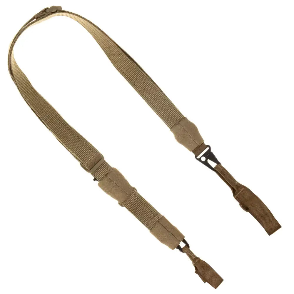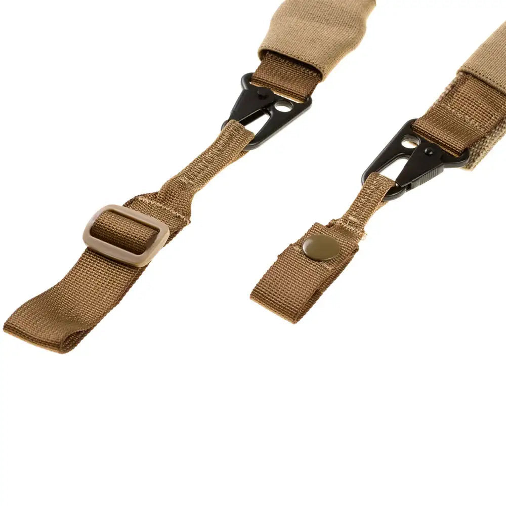 Sangle de pistolet réglable TX-3. La sangle est de couleur beige et possède des clips et des cordons métalliques qui vous permettent d'attacher la sangle de plusieurs manières. Vous pouvez attacher les clips les uns aux autres pour en faire une sangle à 1 point.