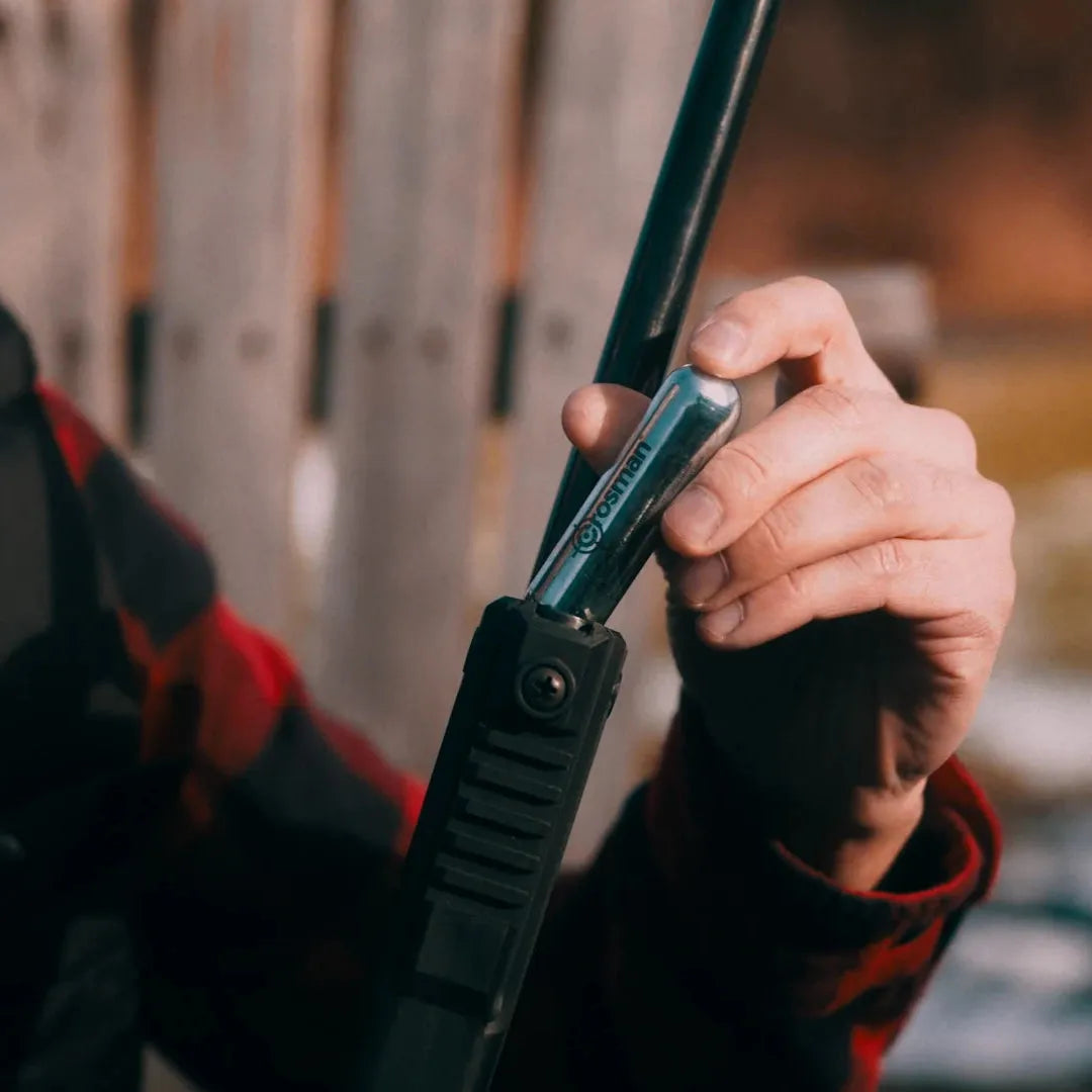 12g Co2 patron settes inn i forskjeftet og du fyller magasinet med 4.5mm pellets. Vi anbefaler opp til 9gr pellets med flat eller avrunda tupp.