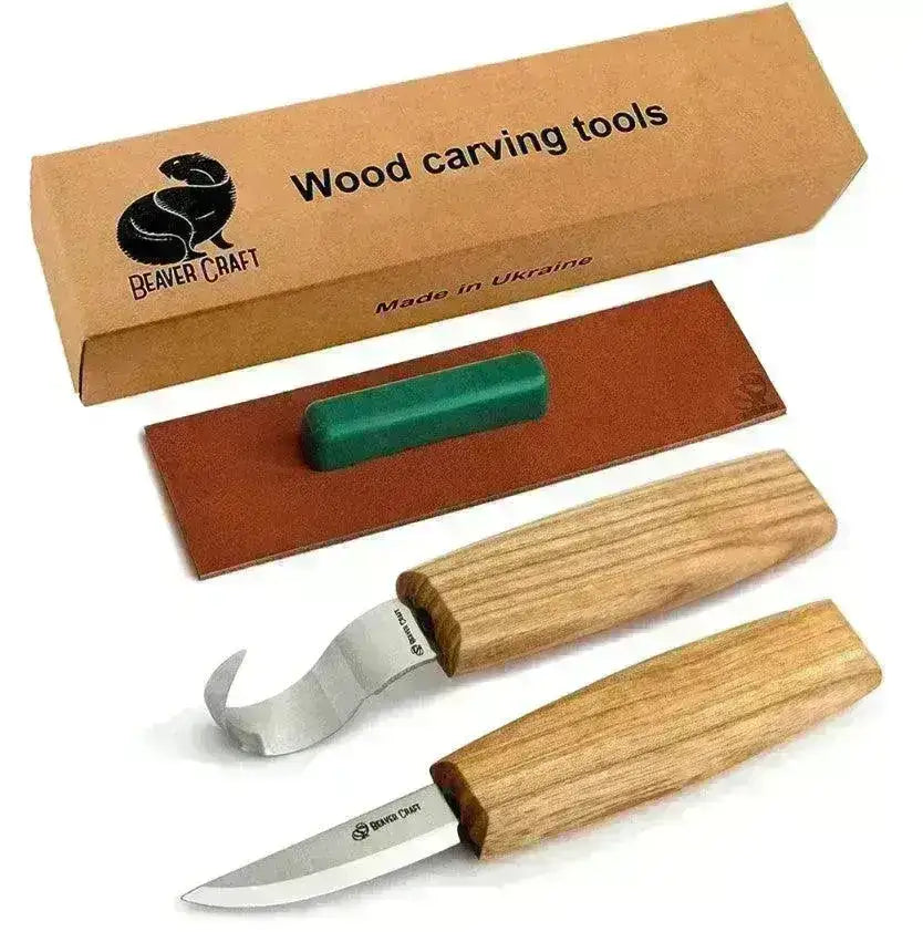 Couteaux faits à la main en Ukraine. L'ensemble S01 est parfait pour ceux qui veulent un bon équipement de sculpture sur bois qui vous permet de façonner et de creuser le bois avec précision et efficacité. Le couteau courbé de cet ensemble de sculpture est parfait pour creuser des cuillères, des bols et autres. Le couteau à découper inclus a une lame courte et précise et peut être utilisé pour la plupart des travaux de sculpture sur bois.