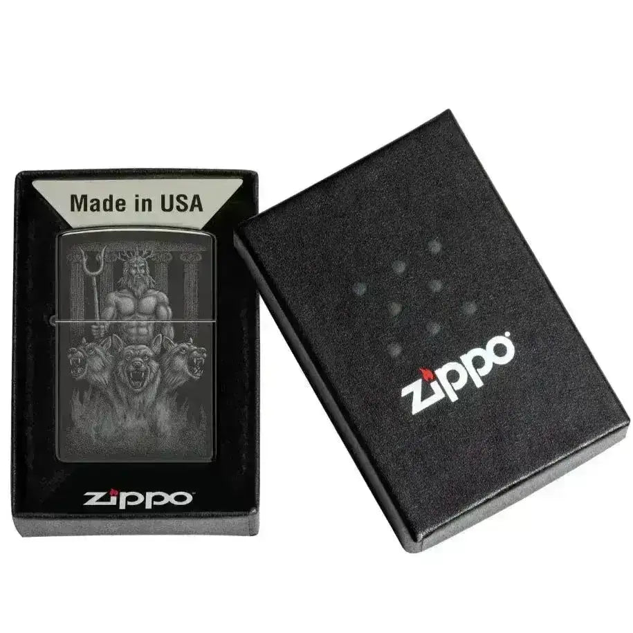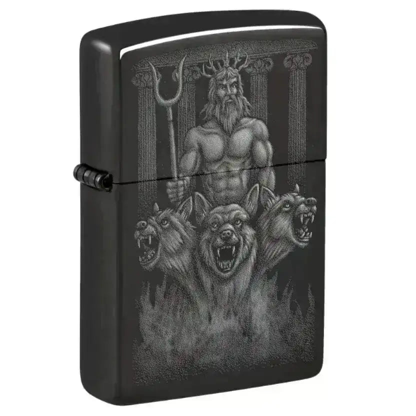 Superbe briquet Zippo en noir poli avec un design impressionnant montrant un dieu puissant flanqué de chiens de garde. Ce briquet fiable et élégant est à la fois un objet fonctionnel et décoratif, idéal pour un usage quotidien ou comme cadeau.