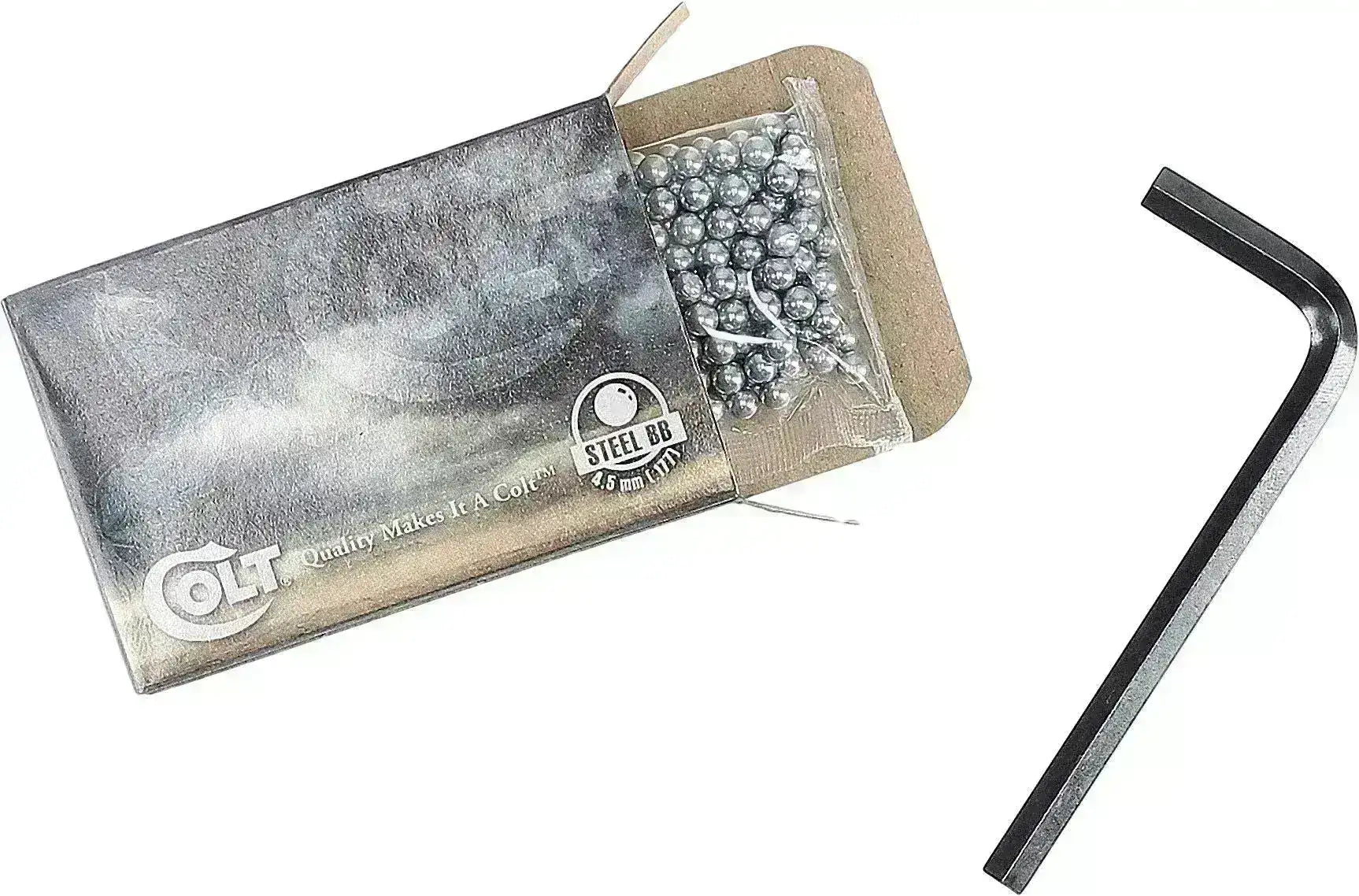 Cette version pistolet à air comprimé tire des balles rondes (bb) et est une belle réplique avec les marquages d'origine. Le pistolet est fabriqué par Umarex sous licence Colt. De plus, il est doté d'un blowback efficace et percutant qui contribue à élever le réalisme d'un cran. Le pistolet est entièrement en métal, ce qui lui confère un bon poids de près de 1 kg (930 g). Grâce au viseur de combat du pistolet, ce pistolet est facile à viser.