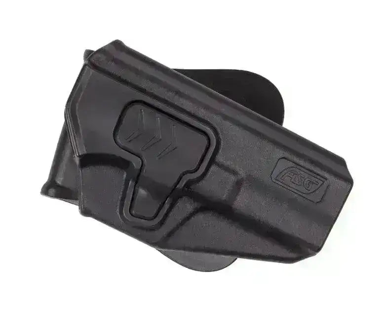 Sortez votre arme rapidement avec cet étui en polymère moulé. le pistolet se verrouille automatiquement lorsqu'il est rangé dans son étui et peut être dégainé rapidement grâce à un bouton de déclenchement agrandi. L'étui est livré avec une attache de ceinture et peut pivoter à 360° afin que vous obteniez l'angle qui vous convient. Le dos de l'étui est recouvert de caoutchouc, ce qui lui permet de s'asseoir confortablement contre la hanche.