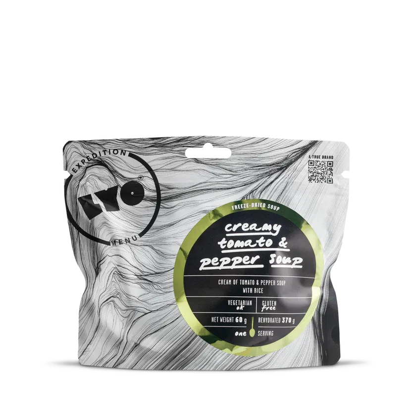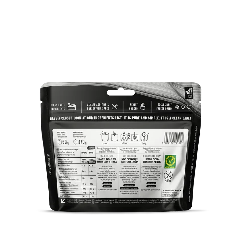 LYOFOOD Creamy Tomato & Pepper Soup kombinerer moden tomat og rød paprika i en kremet og varmende suppe. Laget med 100 % naturlige ingredienser, helt uten gluten og kunstige tilsetningsstoffer. Perfekt som lett middag, mellommåltid eller forrett på fjelltur, camping eller ekspedisjoner der rask energi og god smak er viktig.