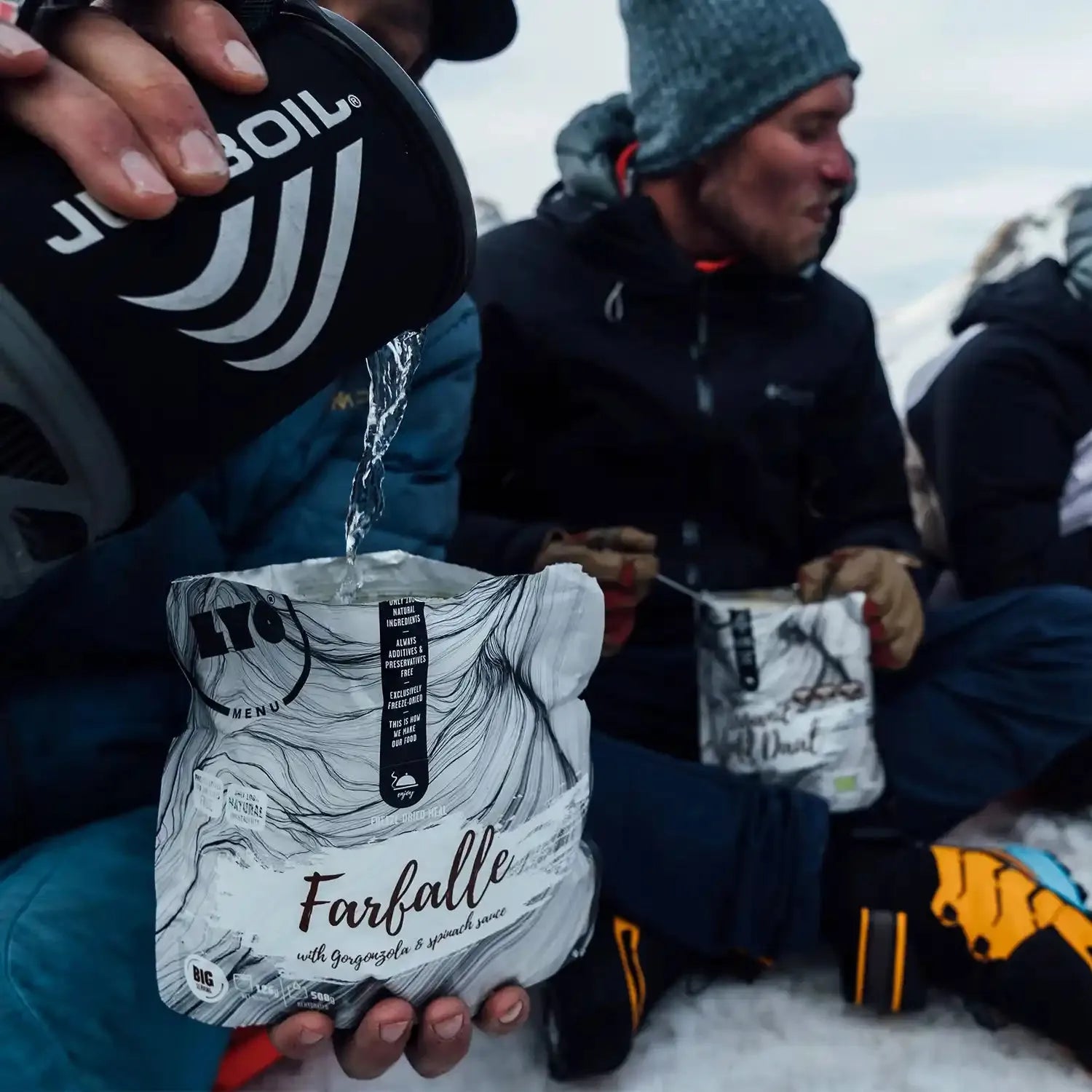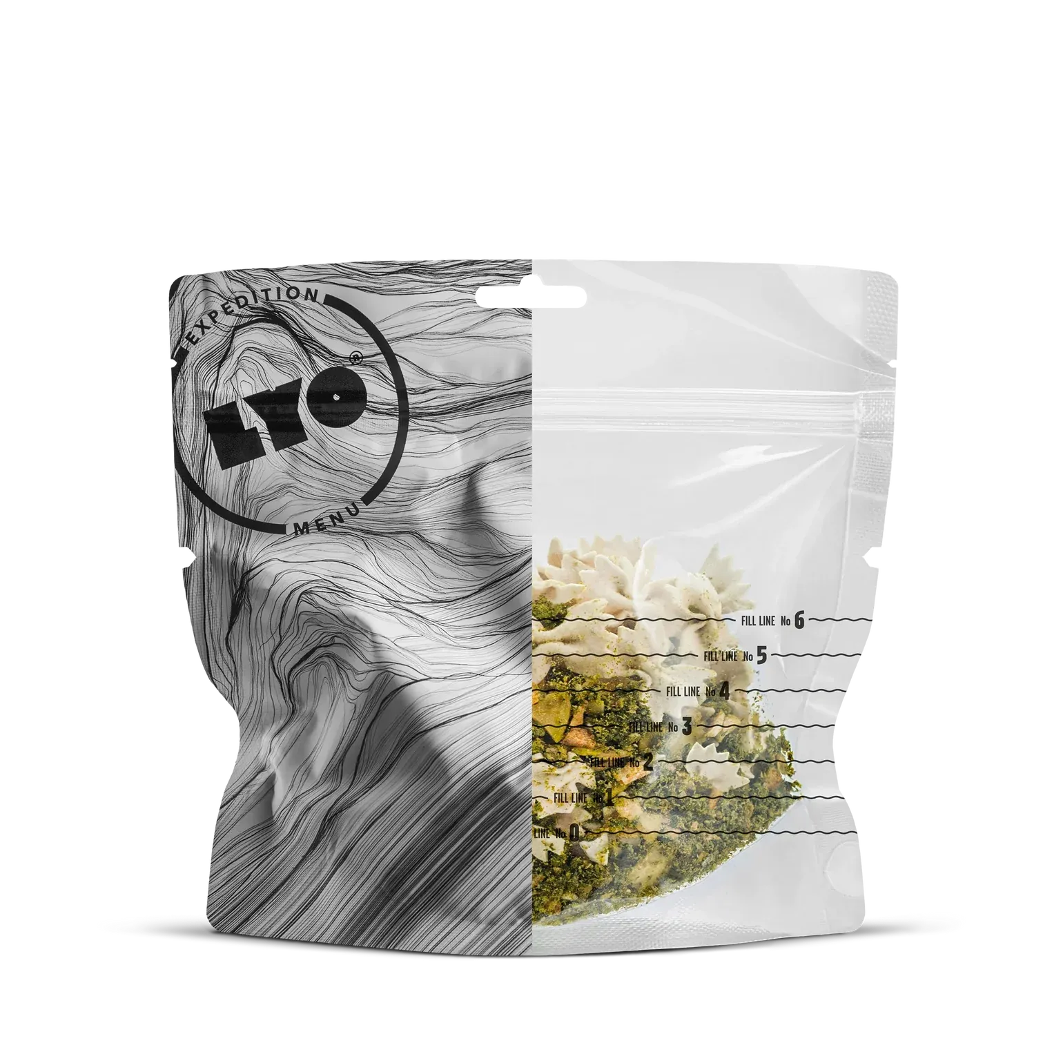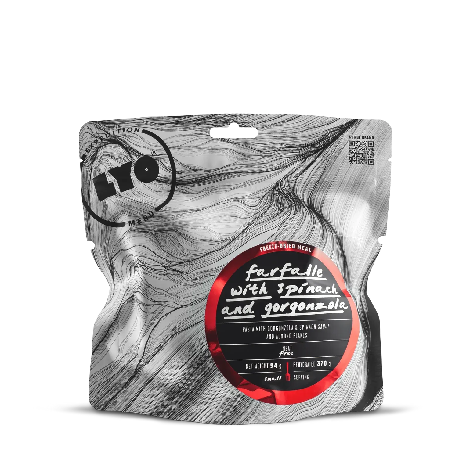LYOFOOD Farfalle med spinat og gorgonzola gir deg ekte italiensk pastasmak på tur. En kremet saus med spinat og mild blåmuggost kombineres perfekt med farfalle-pasta. Laget med 100 % naturlige ingredienser, uten konserveringsmidler, og frysetørket for lav vekt og lang holdbarhet. Perfekt for camping, fjellturer og ekspedisjoner.