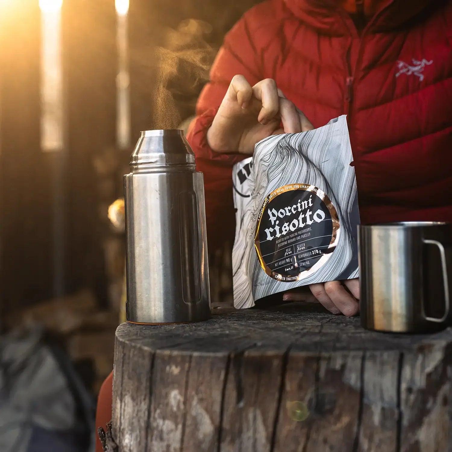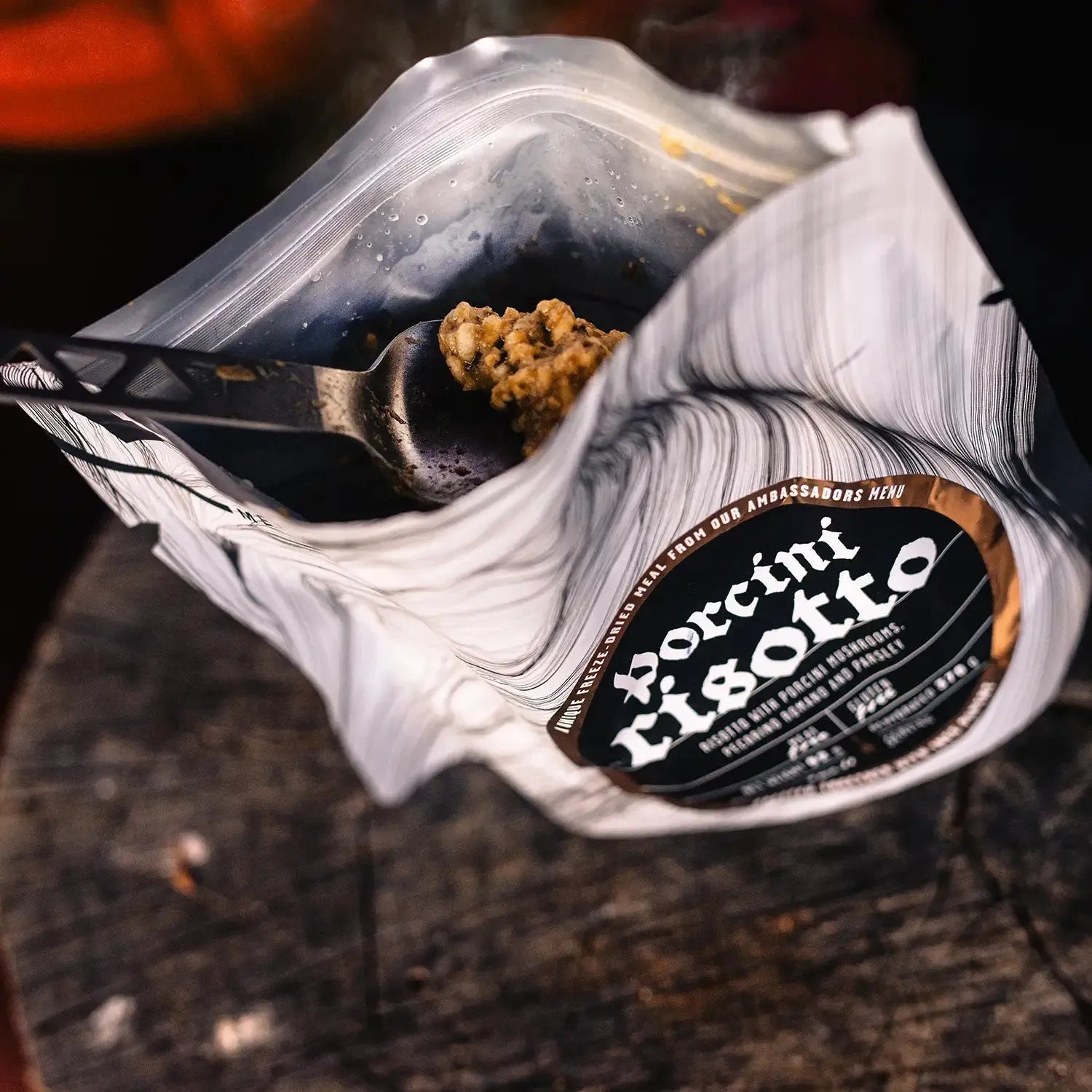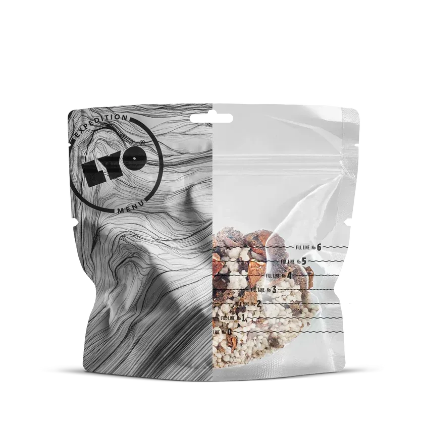 LYOFOOD Porcini Risotto er en kremet turmiddag med ris og steinsopp, også kjent som porcini. Den inneholder smør, fløte, løk og hvitløk, og er smakssatt med urter og en skvett hvitvin for å fremheve den naturlige smaken av sopp. Retten er laget med 100 % naturlige ingredienser – ingen kunstige tilsetningsstoffer – og er perfekt for tur, camping eller som varm middag på kalde kvelder i felt.