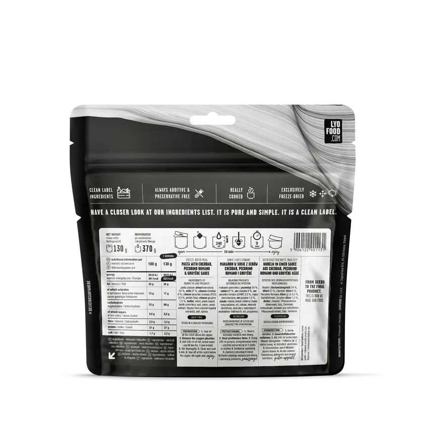 LYOFOOD Mac & Cheese gir deg den ekte smaken av amerikansk ostepasta – i lett og holdbar turvennlig form. Den fyldige retten kombinerer makaroni med en kremet saus basert på ost, melk og smør – alt laget med 100 % naturlige ingredienser og uten kunstige tilsetningsstoffer. Perfekt som rask middag på tur, ekspedisjon eller i beredskapslageret.