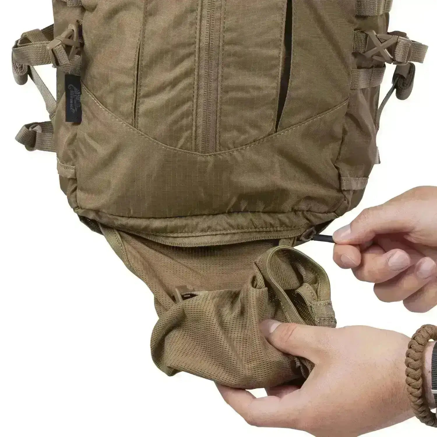 Des deux côtés du sac se trouvent deux poches zippées avec des porte-bouteilles supplémentaires en filet, stabilisés par une sangle de compression. De plus, les deux côtés du sac sont dotés de deux rangées de sangles MOLLE Lite, ce qui donne la possibilité d'attacher des poches supplémentaires. La largeur plus étroite de la sangle rend également le sac plus léger.