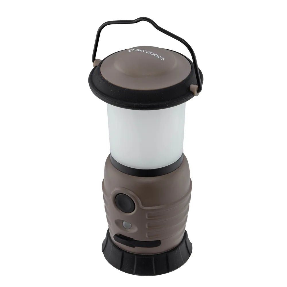 Skywoods 500 Lumens Camping Lantern er en kraftig og allsidig oppladbar lykt laget for camping, vedlikeholdsarbeid og nødbelysning. Den har et robust lampehus i PC + ABS med IPX5 vanntetthet og støtmotstand på opptil 1 meter. Med 15 høyeffektive 2835 LED-dioder leverer lampen opptil 500 lumen og tilbyr flere lysmoduser for ulike behov, inkludert strobelys for varsling. Praktiske kroker i både topp og bunn gjør den enkel å henge opp i telt, på grein eller stativ.