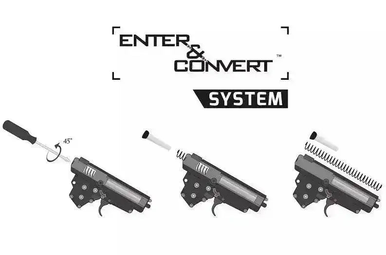 Dès sa sortie de la boîte, ce fusil produit 380 fps. Parfait pour les distances moyennes. Si vous allez jouer à l'intérieur / CQB, nous vous recommandons de passer au ressort M90 fourni, alors vous descendrez à environ 310 ips. Cela va facilement, grâce au système ENTER et CONVERT - qui vous permet de changer de plumes en quelques minutes sans avoir à démanteler le fusil entier.