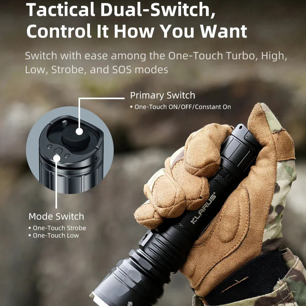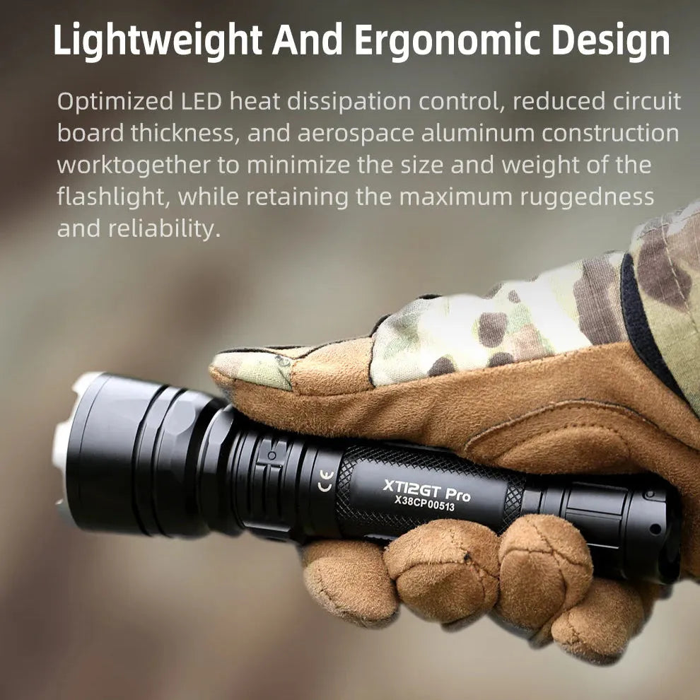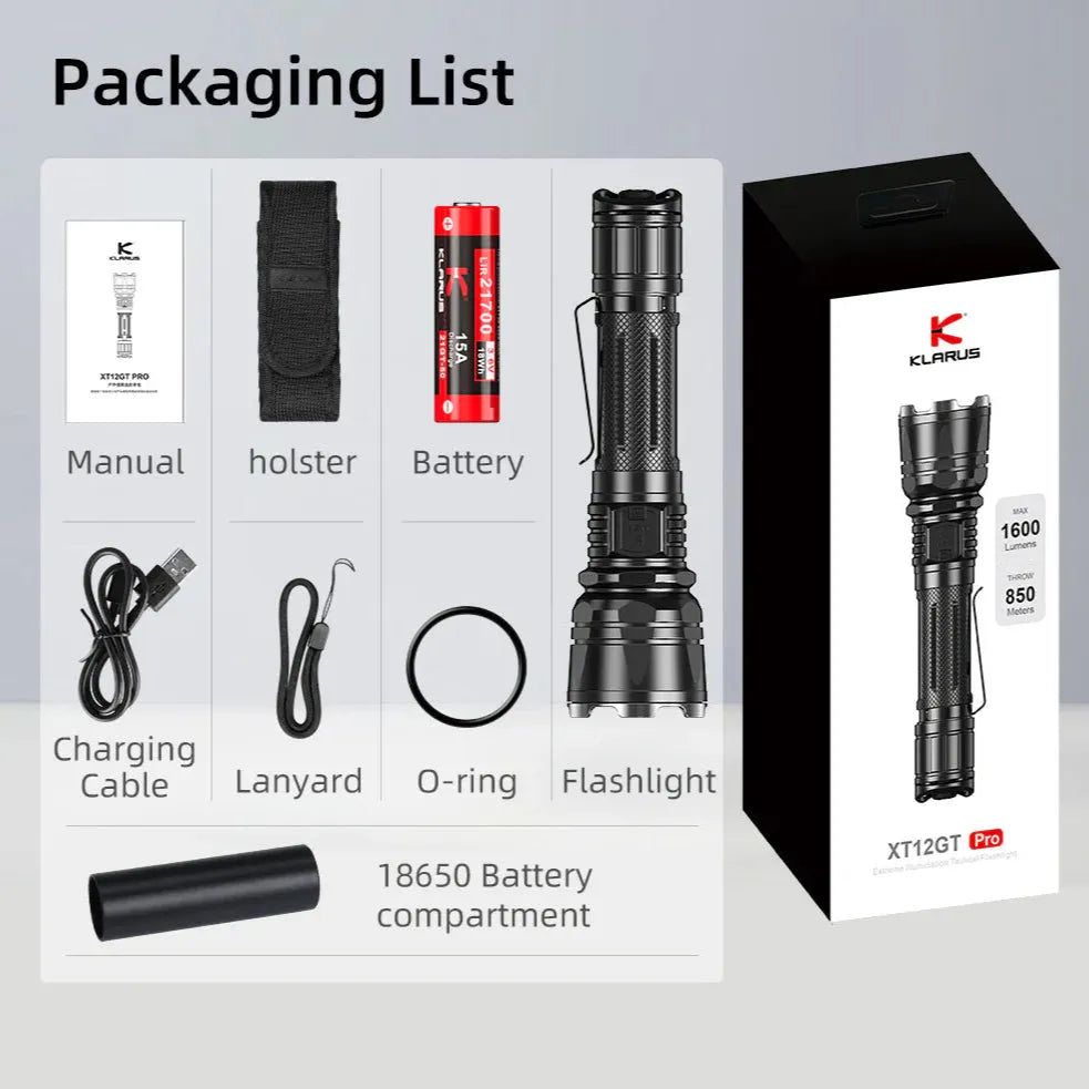 KLARUS XT12GT PRO er en kraftig taktisk lommelykt designet for krevende utendørsforhold. Med en imponerende lysstyrke på 1600 lumen og en ultralang rekkevidde på 850 meter, gir denne lykten eksepsjonell belysning for søk og redningsoperasjoner, jakt og patruljering i mørket.